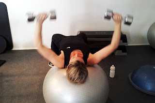 Jag har lagt en hel del fokus på pilatesbollen och balans vilket nu resulterat i en överbelastning i vänster hand. Underbart. Svårt att greppa och alla spänningar gör extremt ont. Så, crosstrainer utan att hålla i handtagen och hantellyft, oavsett riktning, görs med stora grimaser, men skam den som ger sig, träna ska jag. :) Dock har jag tonat ner balansträningen lite tills jag kan stödja normalt på handen igen.